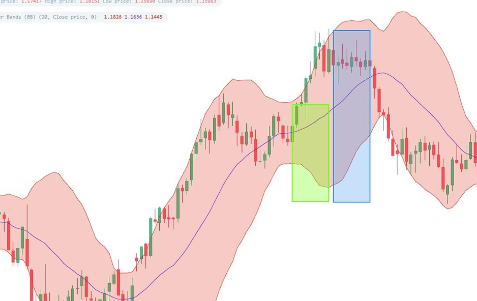 - 밴드 폭이 좁아지면: 변동성 확대(상승 or 하락)의 전조