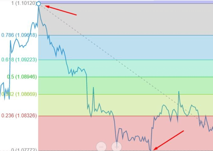 - 가격이 하락한 후 일시적인 반등이 예상될 때, 고점에서 저점까지 피보나치 되돌림을 적용합니다.